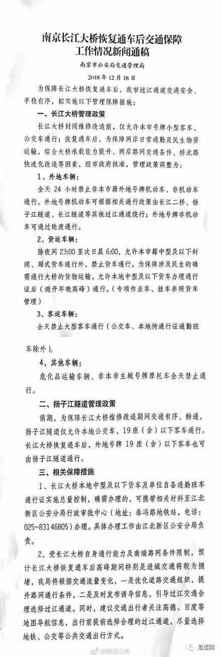 南京市公安交管局剛剛發(fā)布消息,12月29日南京長(zhǎng)江大橋恢復(fù)通車24小時(shí)禁止非本市籍外地號(hào)牌機(jī)動(dòng)車、非機(jī)動(dòng)車通行,禁止大型客車通行,禁止?;愤\(yùn)輸車輛、非本市主城號(hào)牌摩托車通行。